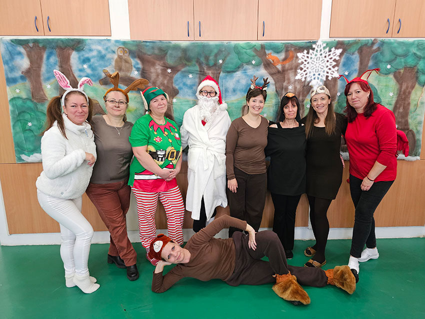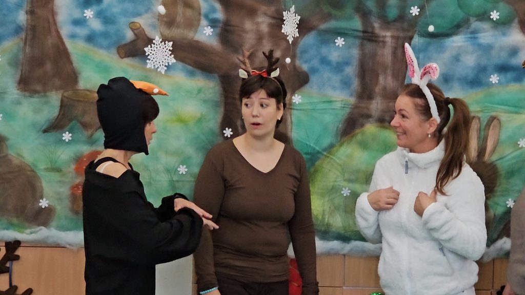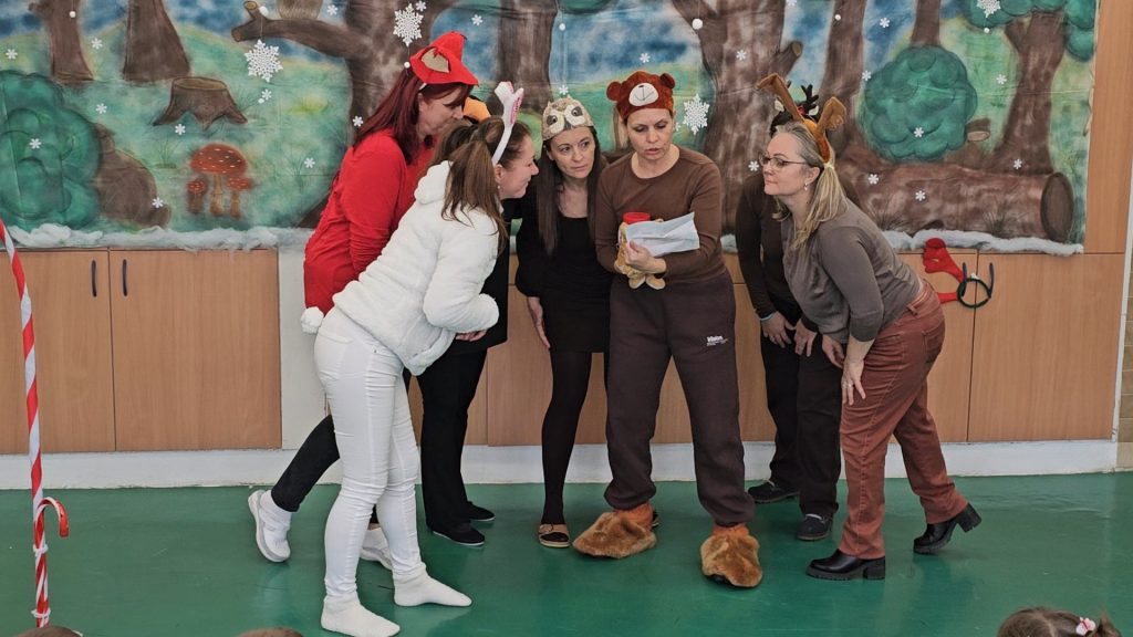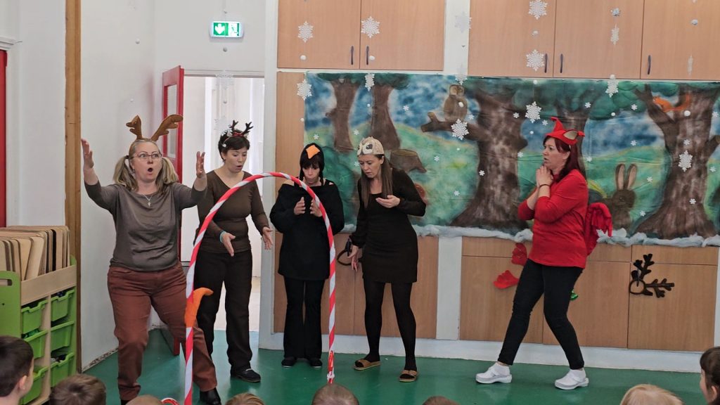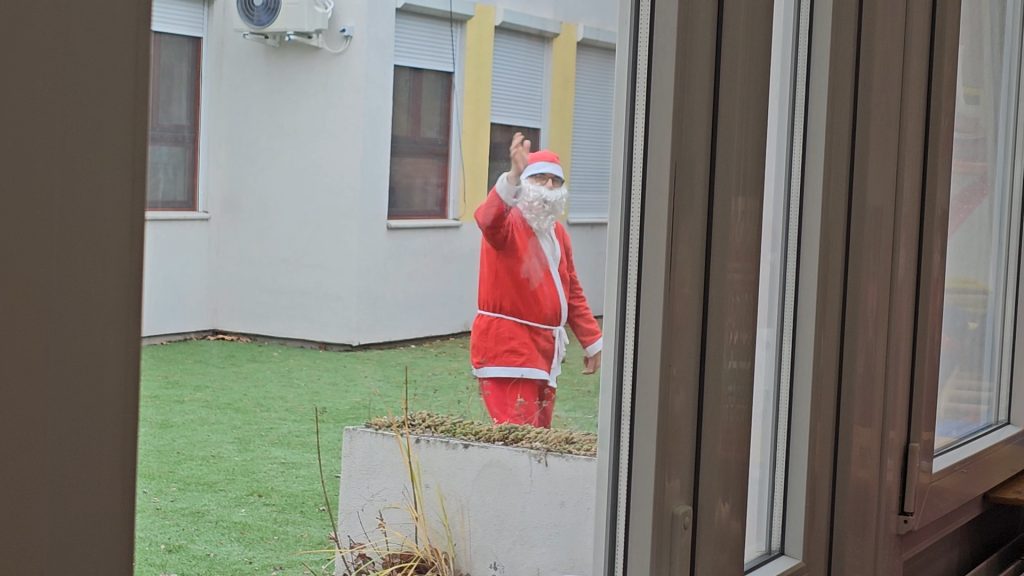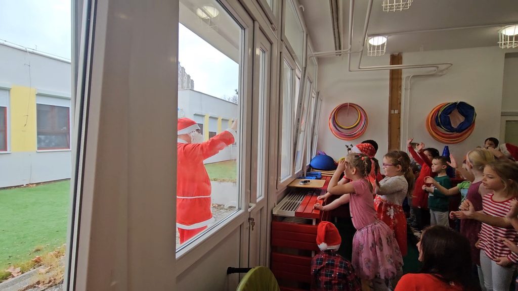 Gyermekeink a „Segítség, sok a hó!” című mesét nézhették meg az óvoda dolgozóinak előadásában, amíg valaki….talán maga a jóságos Mikulás……a kipucolt cipőcskékbe rejtette az ajándékokat….s a mese végét ő is megnézte az ablakon át….így a gyerekek egy pillanatra még láthatták elsuhanó alakját.